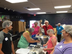 After 32 packages were filled, they were boxed, and our group cheered loudly and shouted “Box number 1”. After that it became a race to fill boxes. We worked for two hours. My team of six worked in a frenzy and won the competition…..we filled 22 boxes! The prize was a T-shirt…..mine said “Feed my starving children and change the world.”