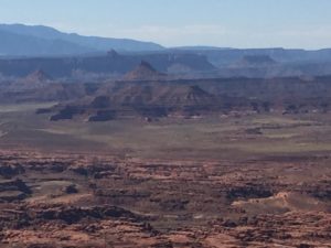 The view at the Overlook rivaled the Grand Canyon. You can see for 30 miles at least. And the structures…..I was perched on great cliffs of Wingate sandstone that fell away 1000 feet, to colorful ribbons and spires of shale and sandstone which stretched all the way to the Colorado river. And this mighty river had cut its own super-canyon by relentlessly grinding away the rock for 5 million years.