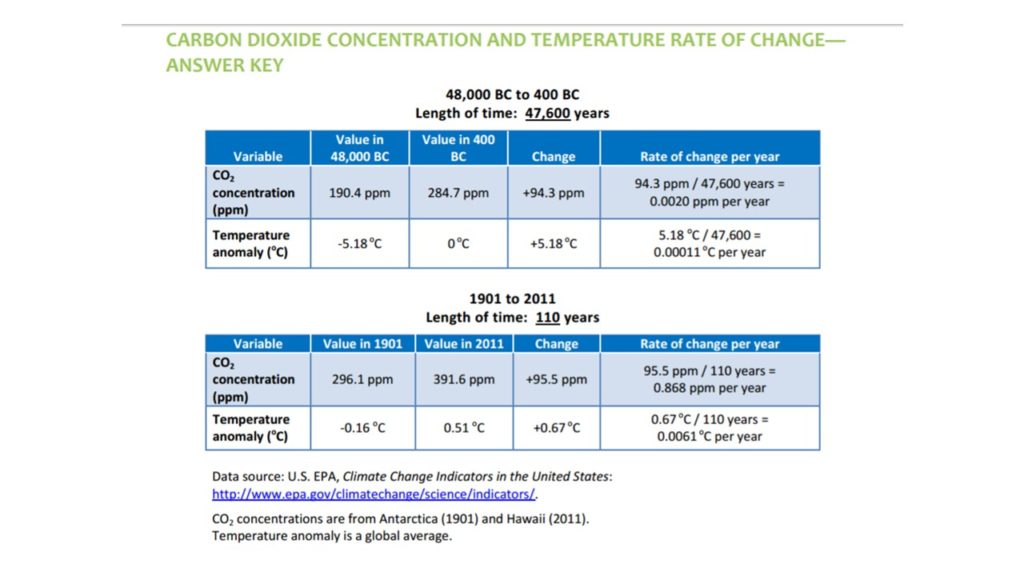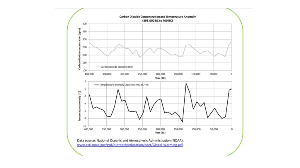 This historical perspective helps us to understand the seriousness of our present global warming trend. In contrast to the geological cycles, the current global warming event is only about 100 years old and the CO2 has risen to about 400 ppm. That is higher than all the four previous geological cycles which each lasted about 100,000 years. See the next table of numbers. Something else must be going on, and yes it’s the man-made industrial revolution. Which is where the accelerated burning of fossil fuels has pushed up the CO2 concentration to a record high. This past 100 years is called the Anthropocene age, meaning man-influenced.