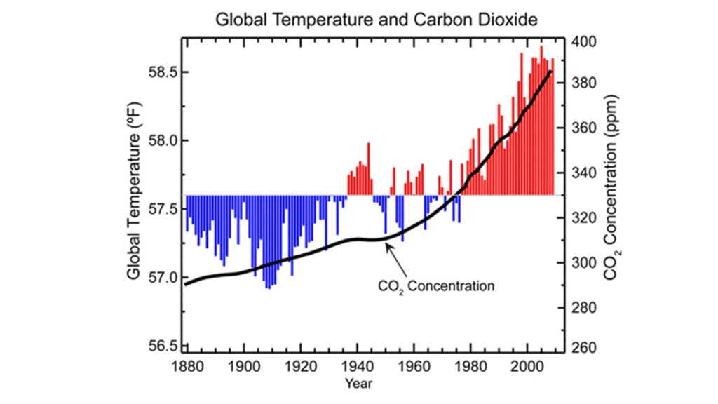 Another telling graph is shown in the next figure (red and blue image), where the recent rise in global temperature is overlaid on the measured CO2 concentration. The conclusion is that the global temperature clearly correlates with CO2 concentration. And, the recent rise in temperature is much too fast to be explained by natural geological cycles.